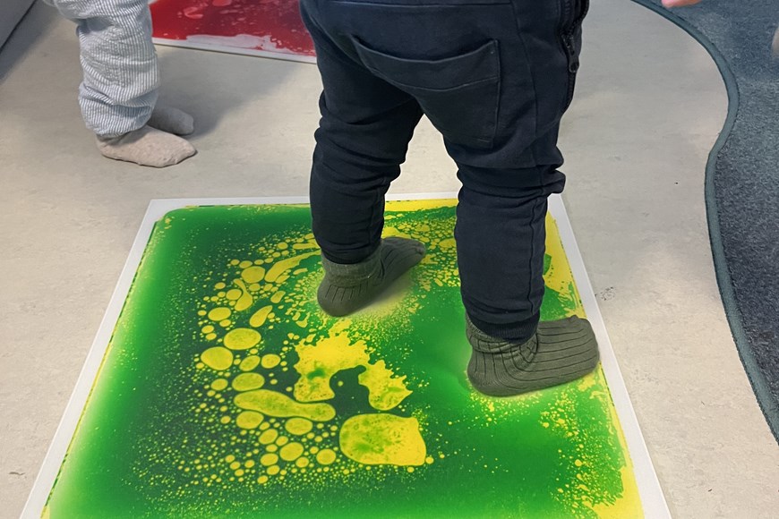 Vi skal opleve farver, der forandrer og blander sig og bliver til nye farver gennem leg og sansninger.